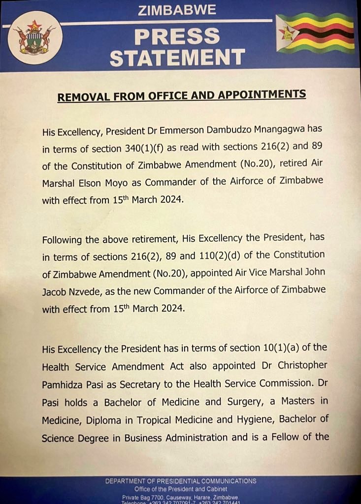 - This evening, Airforce commander Elson Moyo has been fired.