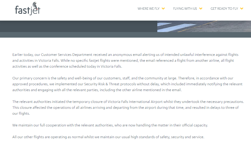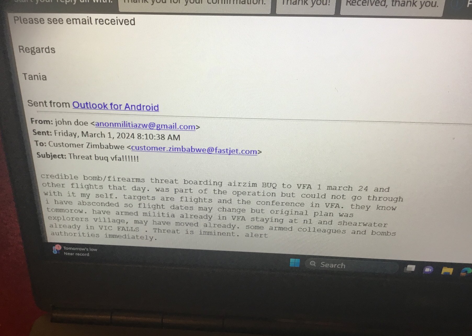 - The email that forced Mnangagwa to abandon his trip was received by Fastjet and it read credible bomb/firearms threat boarding airzim BUQ to VFA 1 march 24 and other flights that day. was part of the operation but could not go through with it my self. targets are flights and the conference in VFA. they know i have absconded so flight dates may change but original plan was tommorow. have armed militia already in VFA staying at nl and shearwater explorers village, may have moved already. some armed colleagues and bombs already in VIC FALLS . Threat is imminent. alert authorities immediately.
