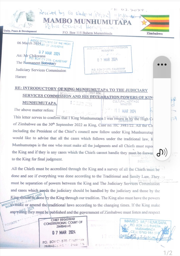 1. Mnangagwa has appointed a new King Munhumutapa ( Timothy Chiminya), of the Rozvi clan who is going around the country installing chiefs).