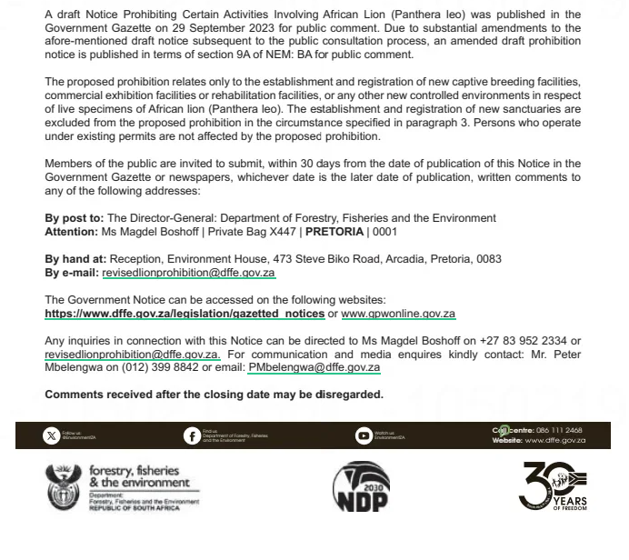 4. South African government has gazetted a ban on breeding of African lion for hunting.