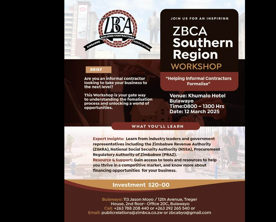 1. Zimbabwe Building contractors Association workshop in Bulawayo to be held in Bulawayo today.