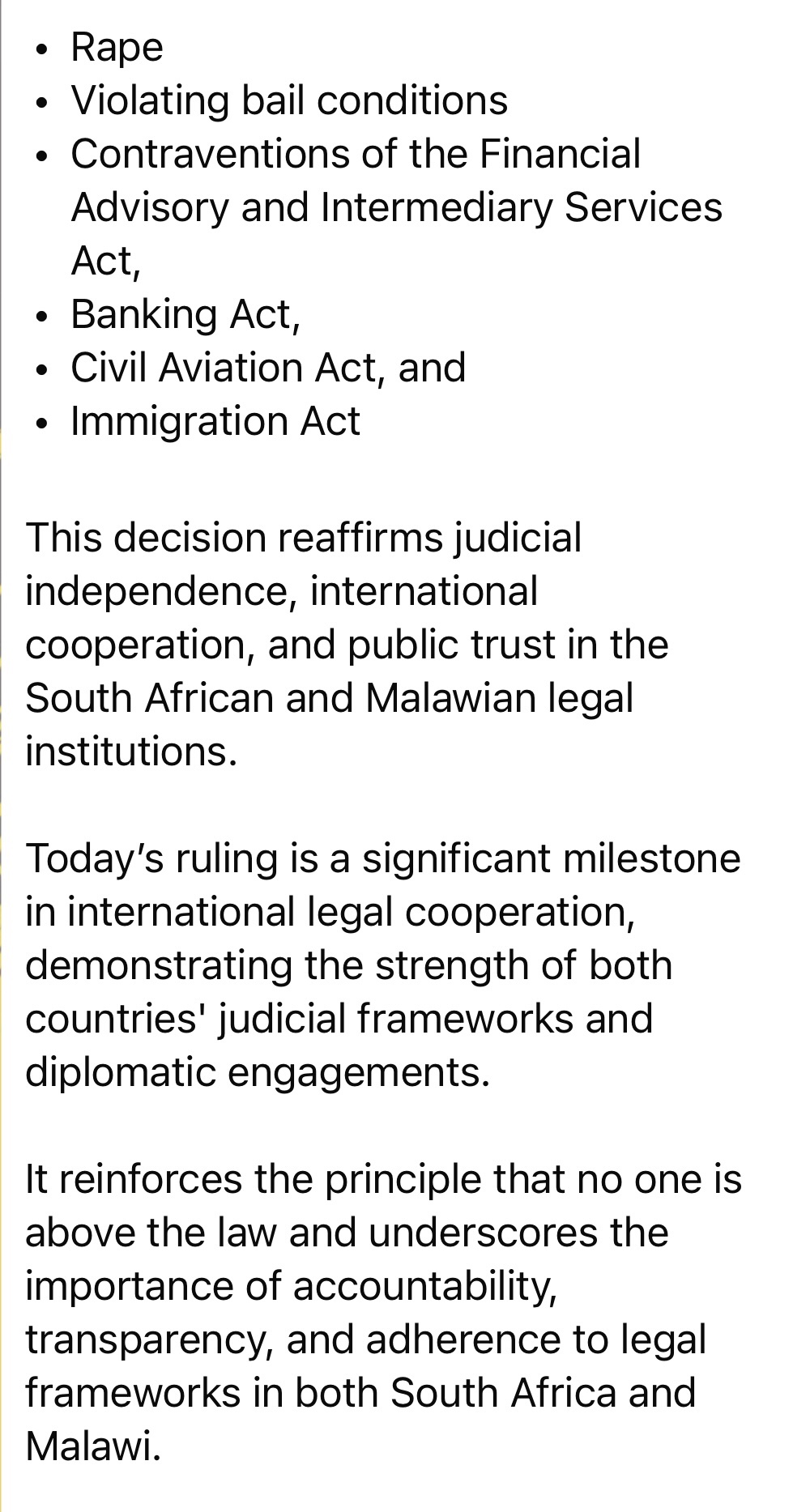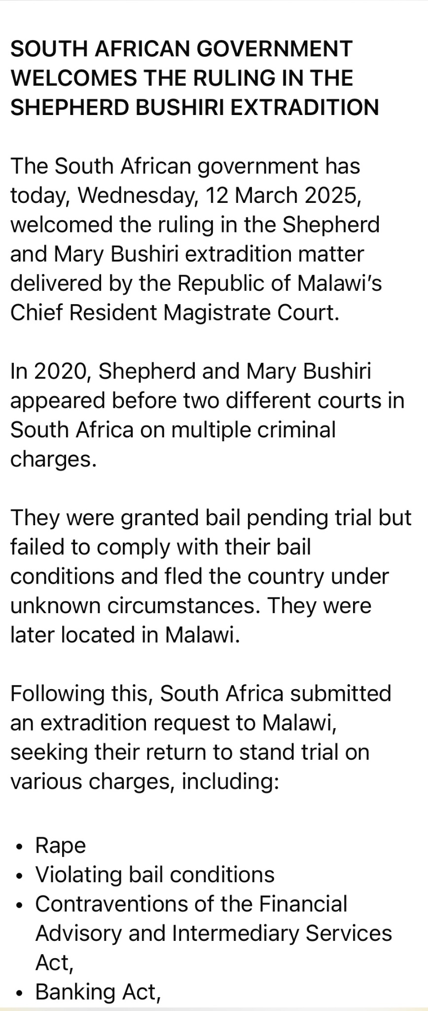 1. Bushiri and his wife Mary are set to be extradited from Malawi to South Africa where they will face multiple charges. Bushiri fled South Africa to Malawi after he was granted bail. Bushiri has appealed the decision and will not be extradited immediately and has been allowed to apply for bail. Bushiri’s dramatic escape from South Africa in November 2020 remains a mystery. It was widely speculated that he and his wife used President Lazarus Chakwera’s presidential plane to flee. The aircraft was subjected to rigorous searches by South African authorities before Chakwera was allowed to depart for Malawi.