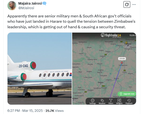 Military blogger, majaira Majairosi has revealed that senior military men & South African gov’t officials who have just landed in Harare to quell the tension between Zimbabwe’s leadership, which is getting out of hand & causing a security threat.