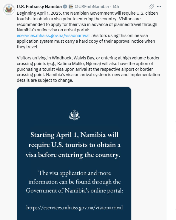 Beginning April 1, 2025, the Namibian Government will require U.S. citizen tourists to obtain a visa prior to entering the country. Visitors are recommended to apply for their visa in advance of planned travel through Namibia’s online visa on arrival portal: https://eservices.mhaiss.gov.na/visaonarrival . Visitors using this online visa application system must carry a hard copy of their approval notice when they travel.