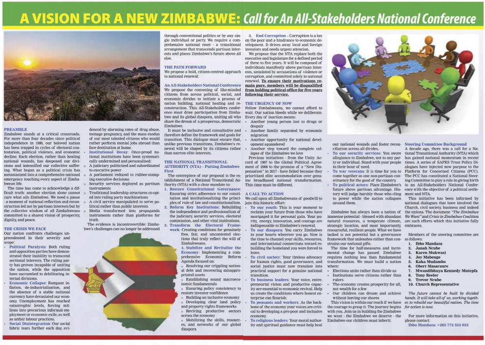 1. National Transitional Authority steering committee has been set up. It incudes lower level activists led by Ibbo Mandaza.