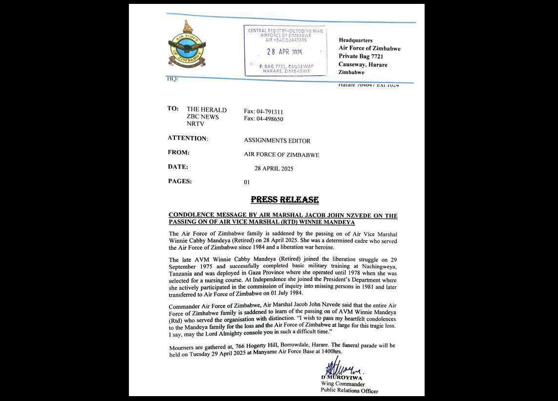 1. AIR Vice Marshal (Retired) Winnie Mandeya, a senior officer of the Air Force of Zimbabwe (AFZ), has died. There is going to be a grand Funeral parade for the Retired Air Marshal Winnie Cabby Mandeya today at the Grandious, lofty ground and the Heroic Manyame Air Force HQ base in Zimbabwe tomorrow Tuesday 29 April 2025.