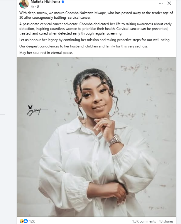 With deep sorrow, we mourn Chomba Nakazwe Mwape, who has passed away at the tender age of 30 after courageously battling cervical cancer.