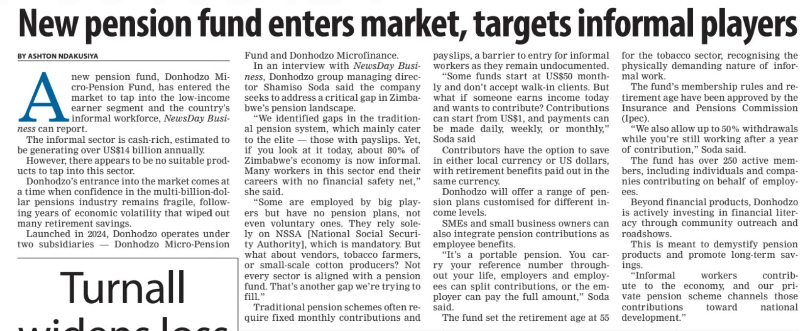 Donhodzo Micro Pension Fund has contributions as little as $1 a day. The Pension Fund has been approved by IPEC.