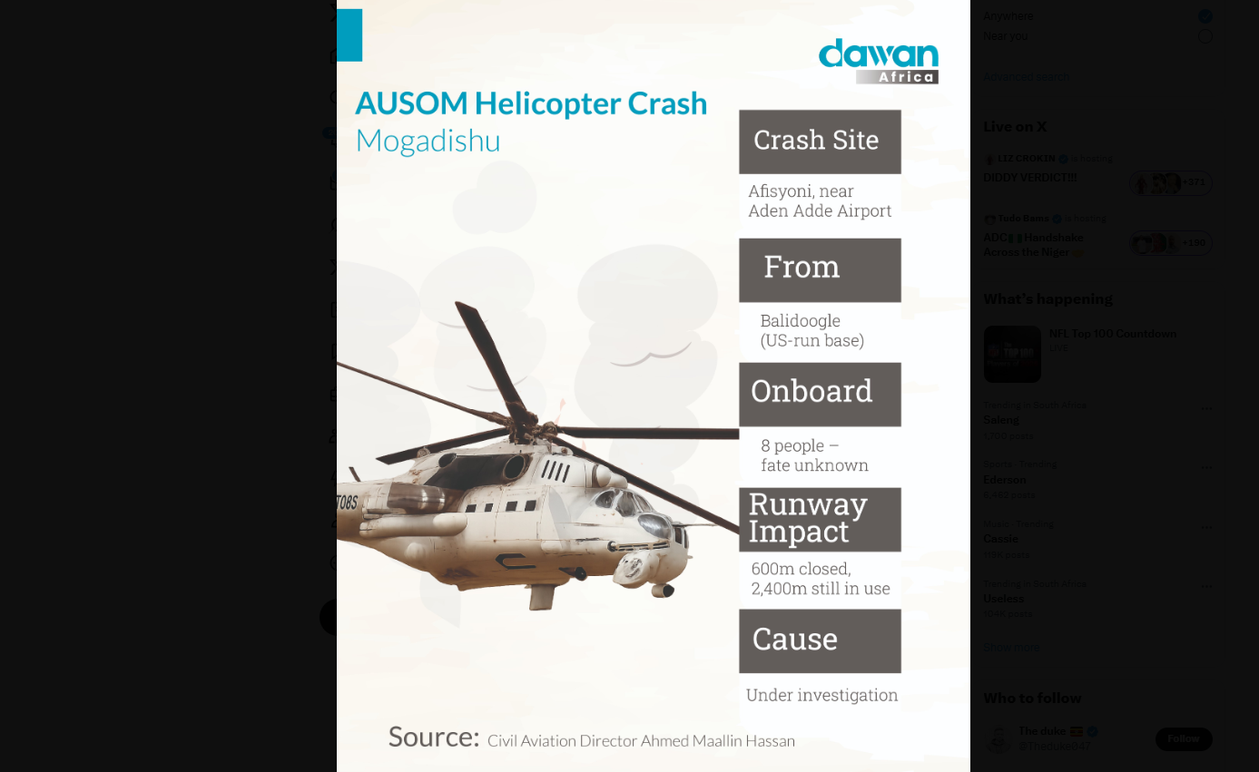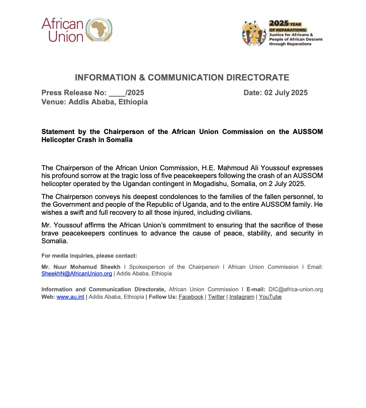 The Chairperson of the African Union Commission, H.E. Mahmoud Ali Youssouf @ymahmoudali expresses his profound sorrow at the tragic loss of five peacekeepers following the crash of an @aussom_ helicopter operated by the Ugandan contingent in Mogadishu, Somalia, on 2 July 2025.