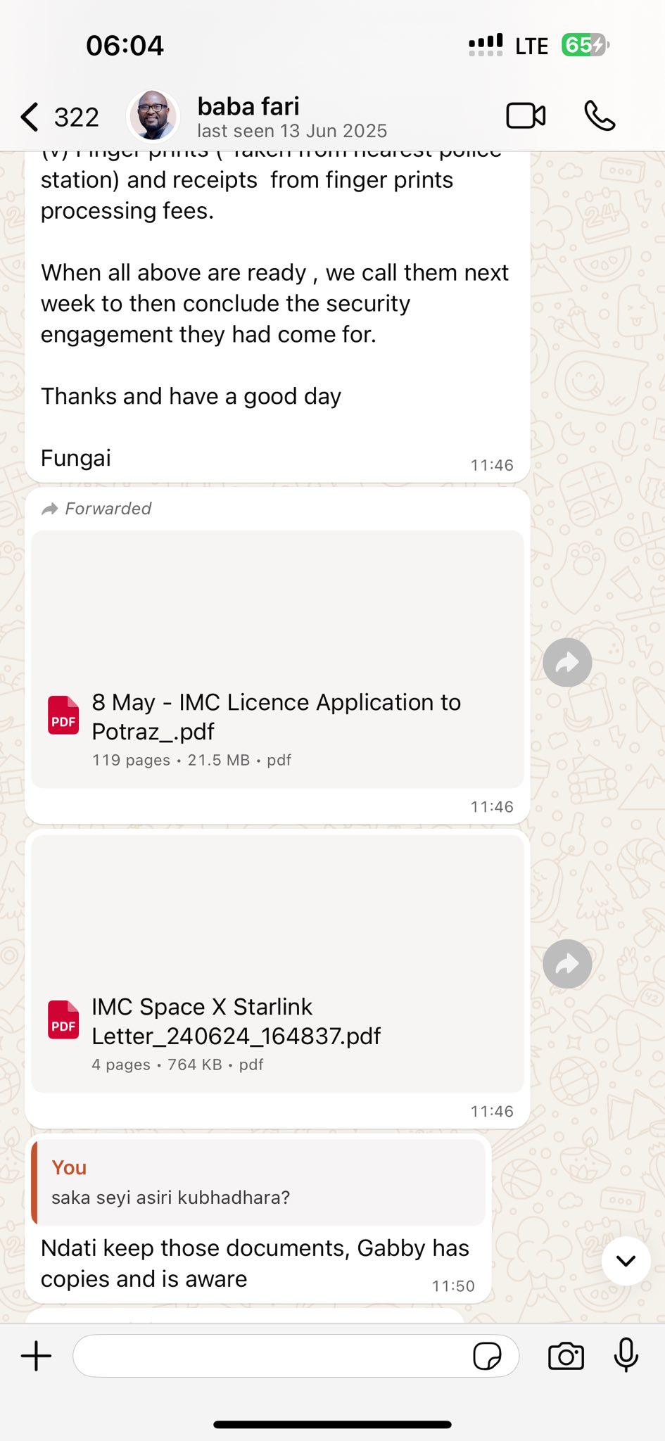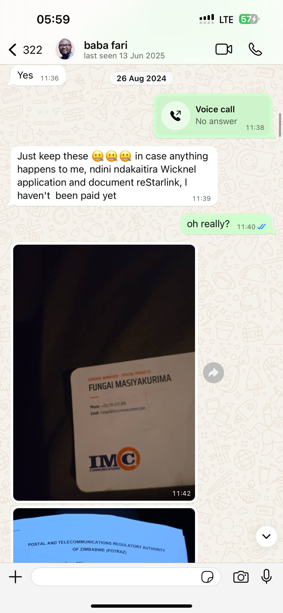 Was called in within the first 4hours when Fungai was taken to Hospital.Got to Arundale Hospital and immediately arranged for a transfer after my brother had made me listen to audios that were sent by Wicknell after he had told him he needed his money because he was getting admitted.My inner gut feeling told me the hospital wasn’t safe for my brother after i realised it had taken them 3 hours to just administer a drug which we had bought for dissolving blood clots.After successfully moving him to Dandaro Hospital,security had clear instructions on which Doctors were allowed to attend to Fungai and only 5 pple allowed to see him.