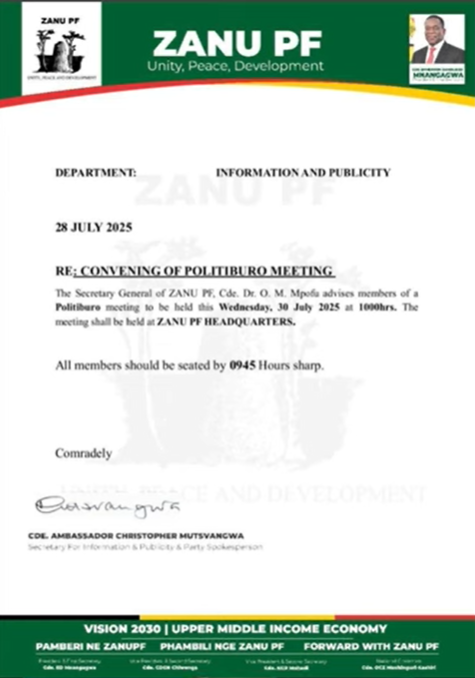1. ZANU-PF Politiburo meeting to be held at 10:00 this morning.