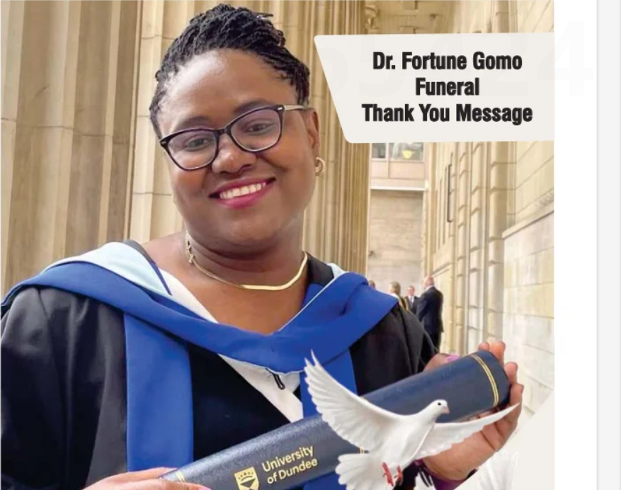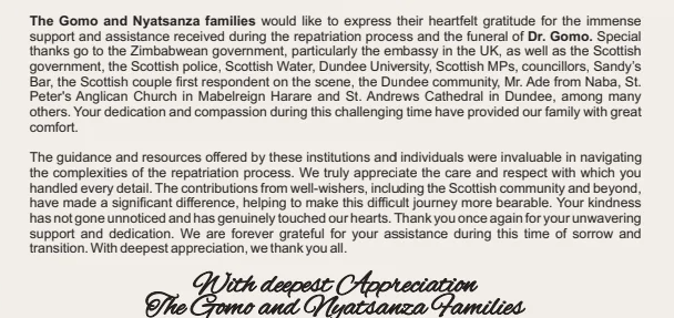 2. The Gomo and Nyatsanza families would like to express their heartfelt gratitude for the immense support and assistance received during the repatriation process and the funeral of Dr. Gomo. Special thanks go to the Zimbabwean government, particularly the embassy in the UK, as well as the Scottish government, the Scottish police, Scottish Water, Dundee University, Scottish MPs, councillors, Sandy’s Bar, the Scottish couple first respondent on the scene, the Dundee community, Mr. Ade from Naba, St. Peter’s Anglican Church in Mabelreign Harare and St. Andrews Cathedral in Dundee, among many others. Your dedication and compassion during this challenging time have provided our family with great comfort.