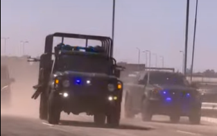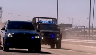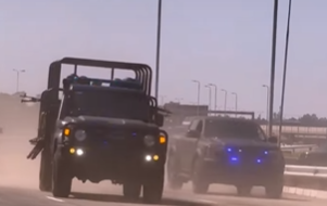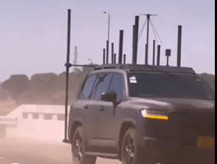 - A dark-colored SUV with jammer antennas (likely another Toyota Land Cruiser)