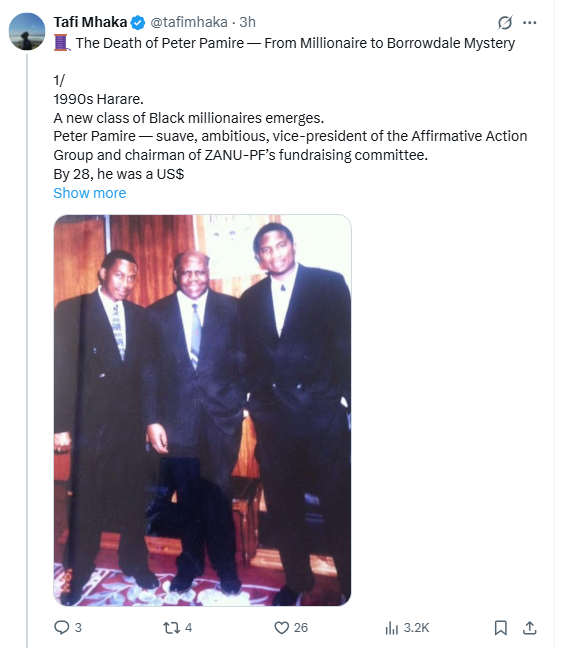 1/ 1990s Harare. A new class of Black millionaires emerges. Peter Pamire — suave, ambitious, vice-president of the Affirmative Action Group and chairman of ZANU-PF’s fundraising committee. By 28, he was a US$ millionaire. By 35, dead in a Pajero crash that still haunts Zimbabwe. What happened to Peter Pamire?