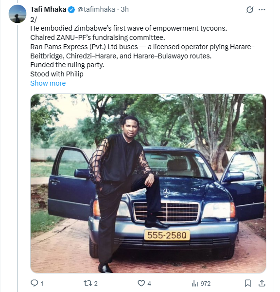 2/ He embodied Zimbabwe’s first wave of empowerment tycoons. Chaired ZANU-PF’s fundraising committee. Ran Pams Express (Pvt.) Ltd buses — a licensed operator plying Harare–Beitbridge, Chiredzi–Harare, and Harare–Bulawayo routes. Funded the ruling party. Stood with Philip Chiyangwa as empowerment took root. Then, it all ended on a quiet Borrowdale road.