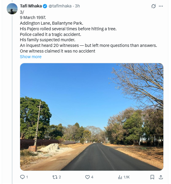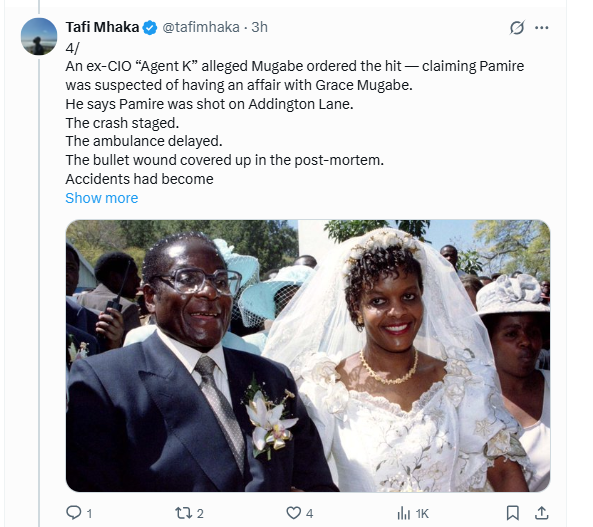 4/ An ex-CIO “Agent K” alleged Mugabe ordered the hit — claiming Pamire was suspected of having an affair with Grace Mugabe. He says Pamire was shot on Addington Lane. The crash staged. The ambulance delayed. The bullet wound covered up in the post-mortem. Accidents had become Zimbabwe’s preferred method of erasing rivals. Pamire never lived to tell his side.