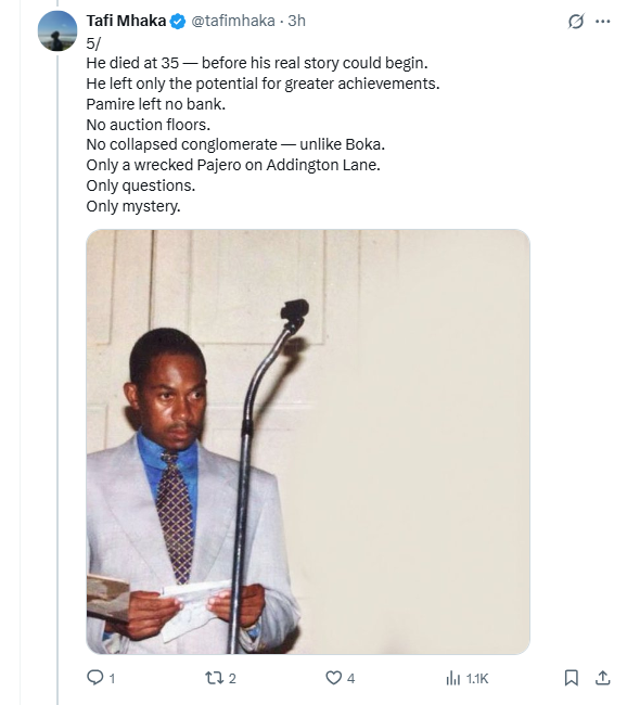 5/ He died at 35 — before his real story could begin. He left only the potential for greater achievements. Pamire left no bank. No auction floors. No collapsed conglomerate — unlike Boka. Only a wrecked Pajero on Addington Lane. Only questions. Only mystery.