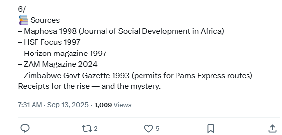 6/Sources – Maphosa 1998 (Journal of Social Development in Africa) – HSF Focus 1997 – Horizon magazine 1997 – ZAM Magazine 2024 – Zimbabwe Govt Gazette 1993 (permits for Pams Express routes) Receipts for the rise — and the mystery.