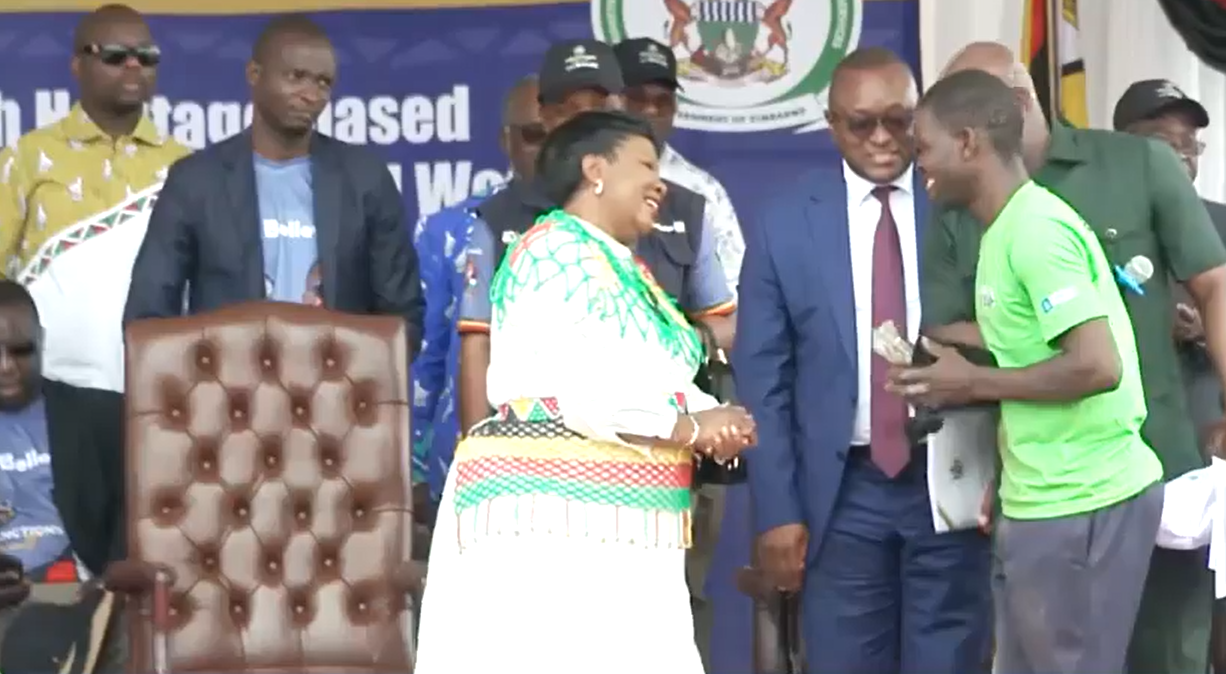Auxillia Mnangagwa handed out a wad of cash to a dancer from her bag. Security was tight as Mnangagwa’s office were providing the signal and did not allow any media houses to bring their equipment next to Mnangagwa.