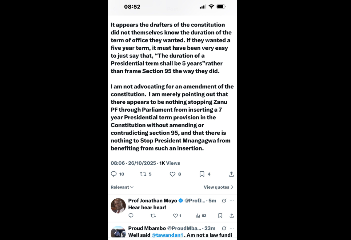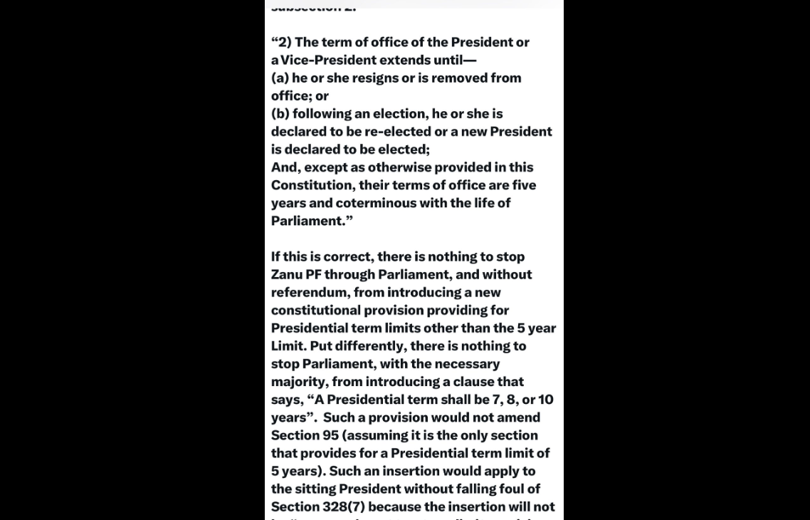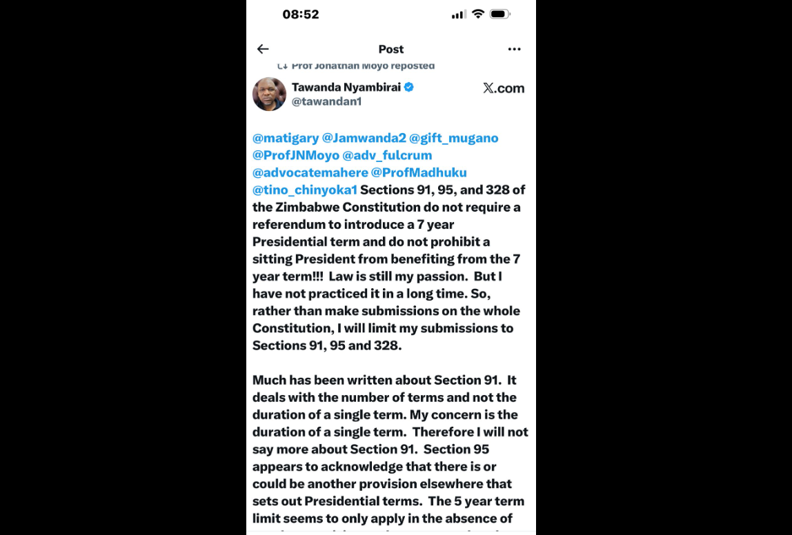 Tawanda Nyambirai is arguing that the Zimbabwe Constitution, specifically Sections 91, 95, and 328, has a loophole that would allow Parliament (specifically Zanu PF, with a two-thirds majority) to introduce a seven-year presidential term without needing a national referendum, and that the sitting President could benefit from it.