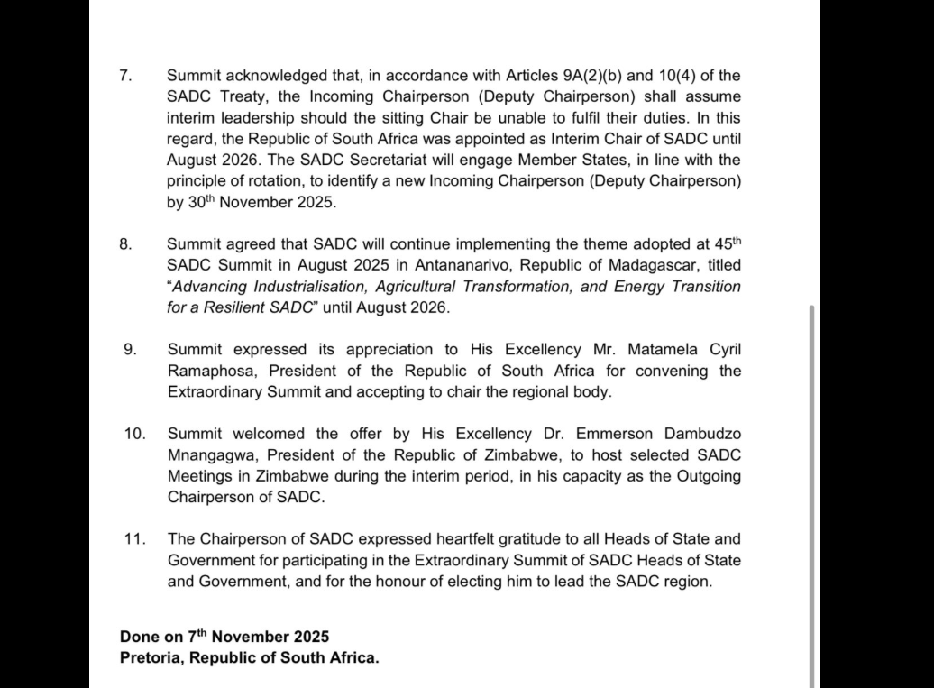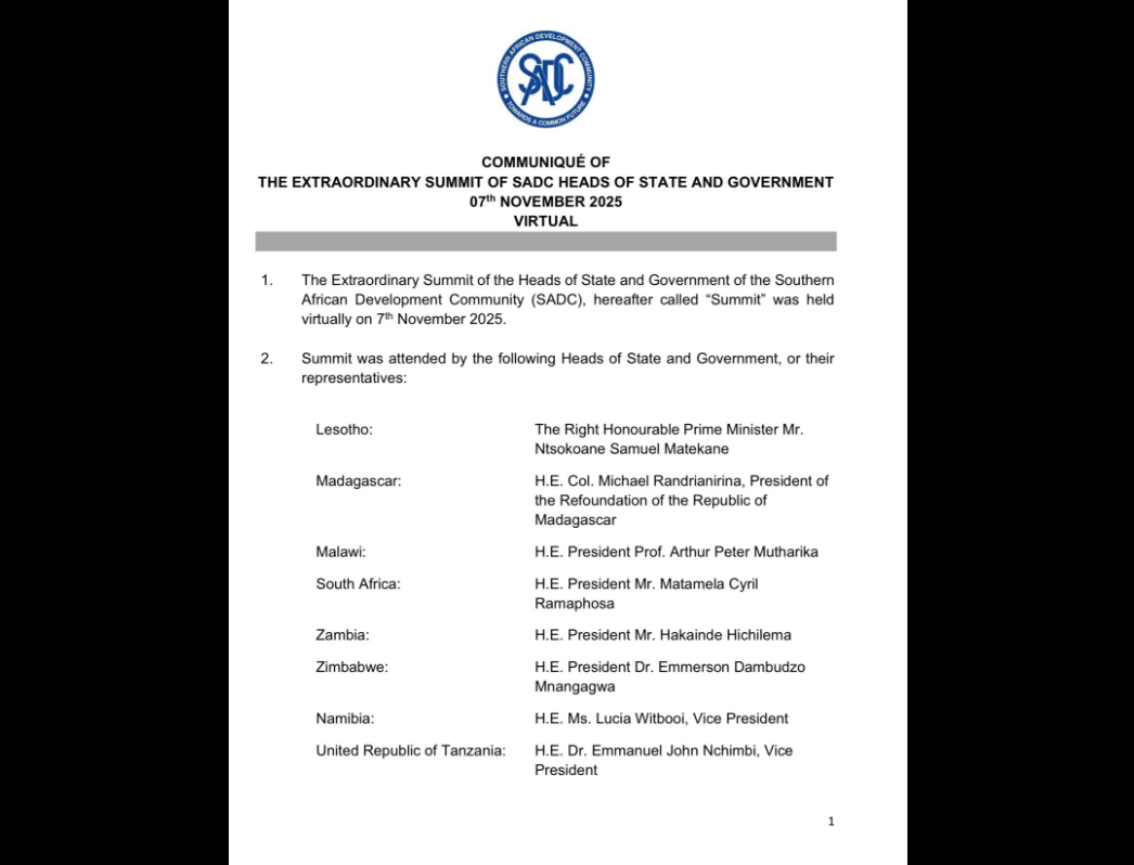 - The Extraordinary Summit of the Heads of State and Government of the Southern African Development Community (SADC), hereafter called āSummitā, was held virtually on 7th November 2025.