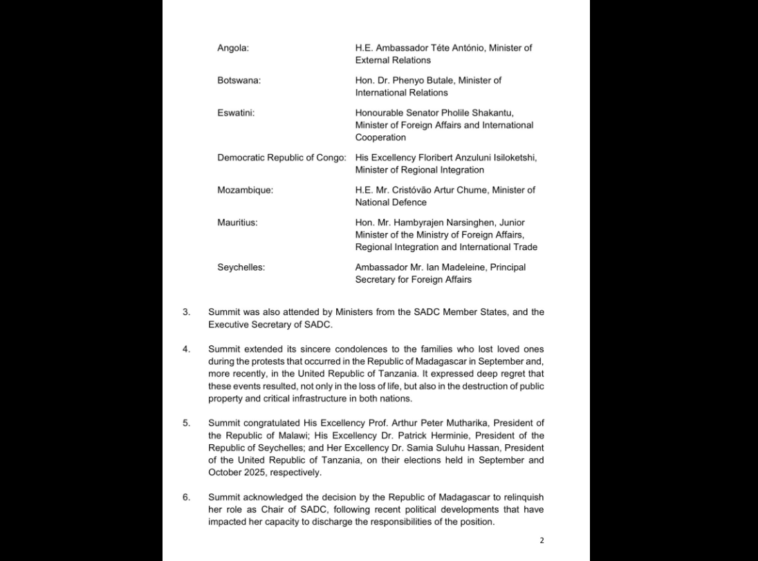 - Summit congratulated His Excellency Prof. Arthur Peter Mutharika, President of the Republic of Malawi; His Excellency Dr. Patrick Herminie, President of the Republic of Seychelles; and Her Excellency Dr. Samia Suluhu Hassan, President of the United Republic of Tanzania, on their elections held in September and October 2025, respectively.